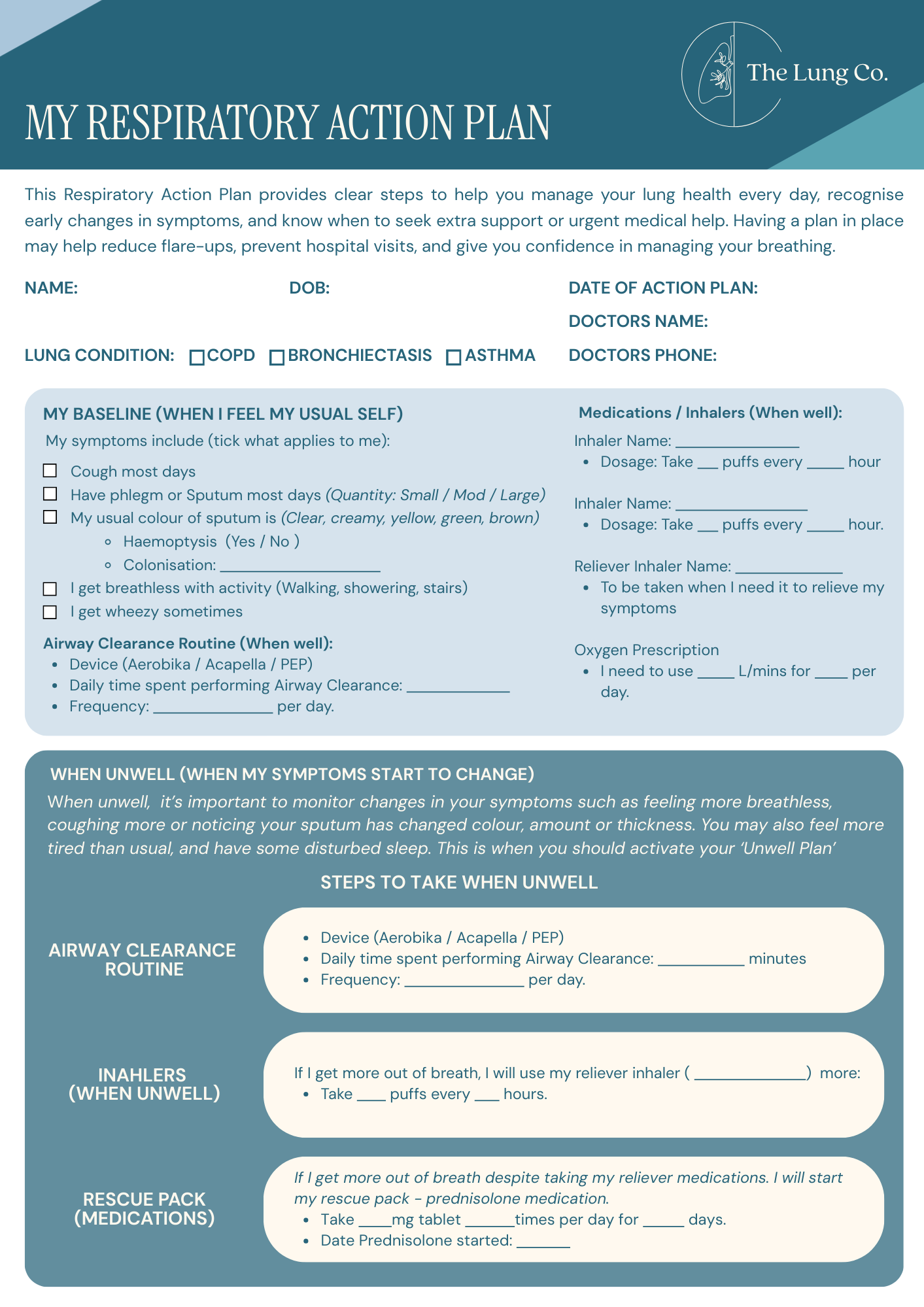 Respiratory Action Plans are a valuable tool for patients with chronic lung conditions, helping to identify exacerbations early, support self-management, and reduce the risk of hospital admission when prompt treatment is initiated. Our Action Plan is available to download free of charge for use with your patients.